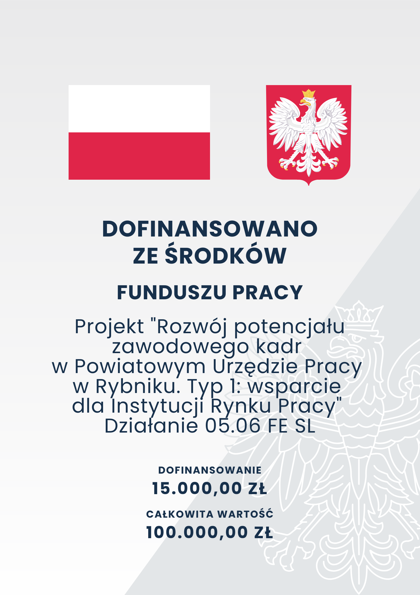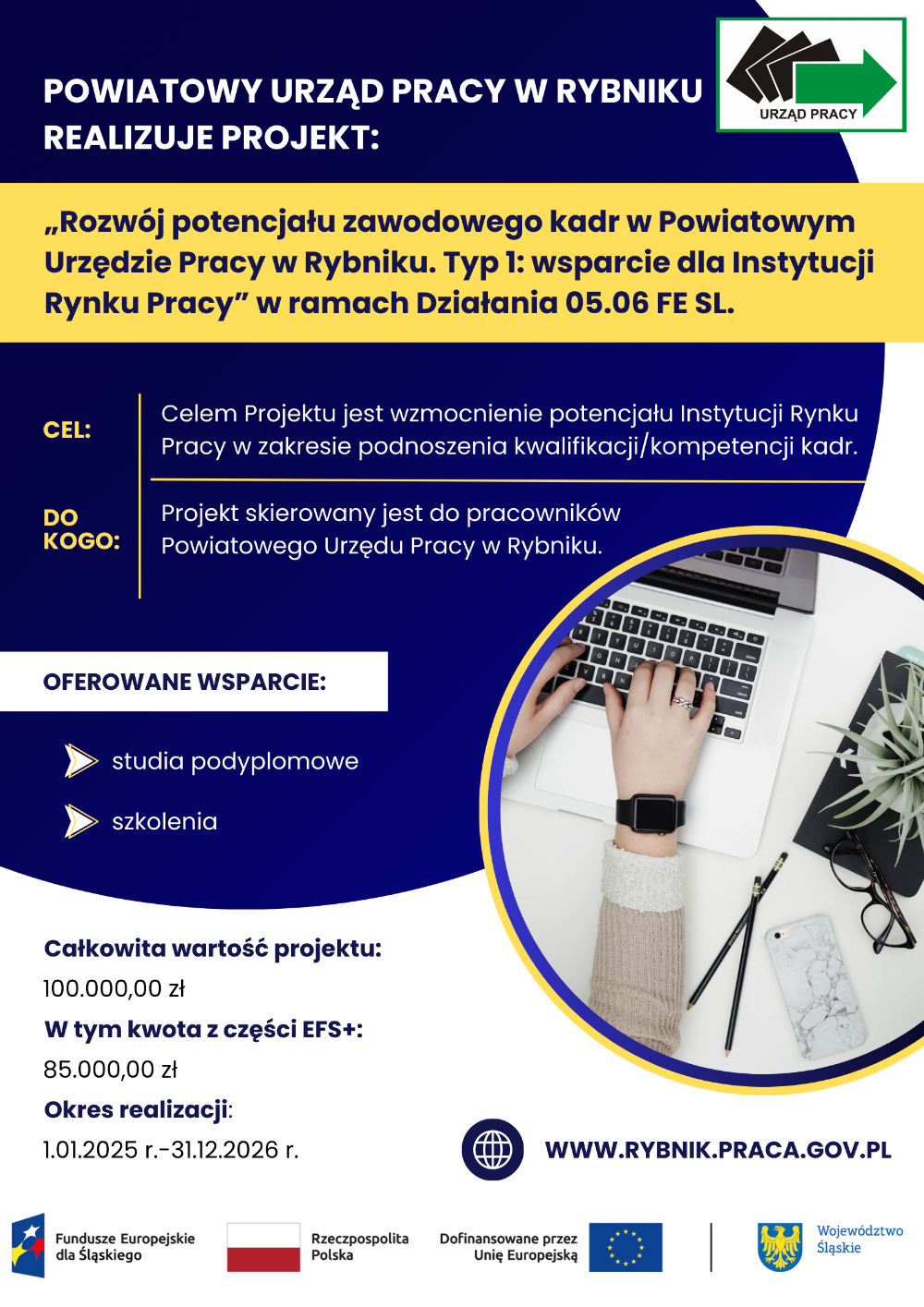 Powiatowy Urząd Pracy w Rybniku realizuje projekt pn. „Rozwój potencjału zawodowego kadr w Powiatowym Urzędzie Pracy w Rybniku. Typ 1: wsparcie dla Instytucji Rynku Pracy” w ramach Programu Fundusze Europejskie dla Śląskiego, Priorytet FESL.05 Fundusze Europejskie dla rynku pracy, Działanie FESL.05.06 Szkolenia dla pracowników IRP.