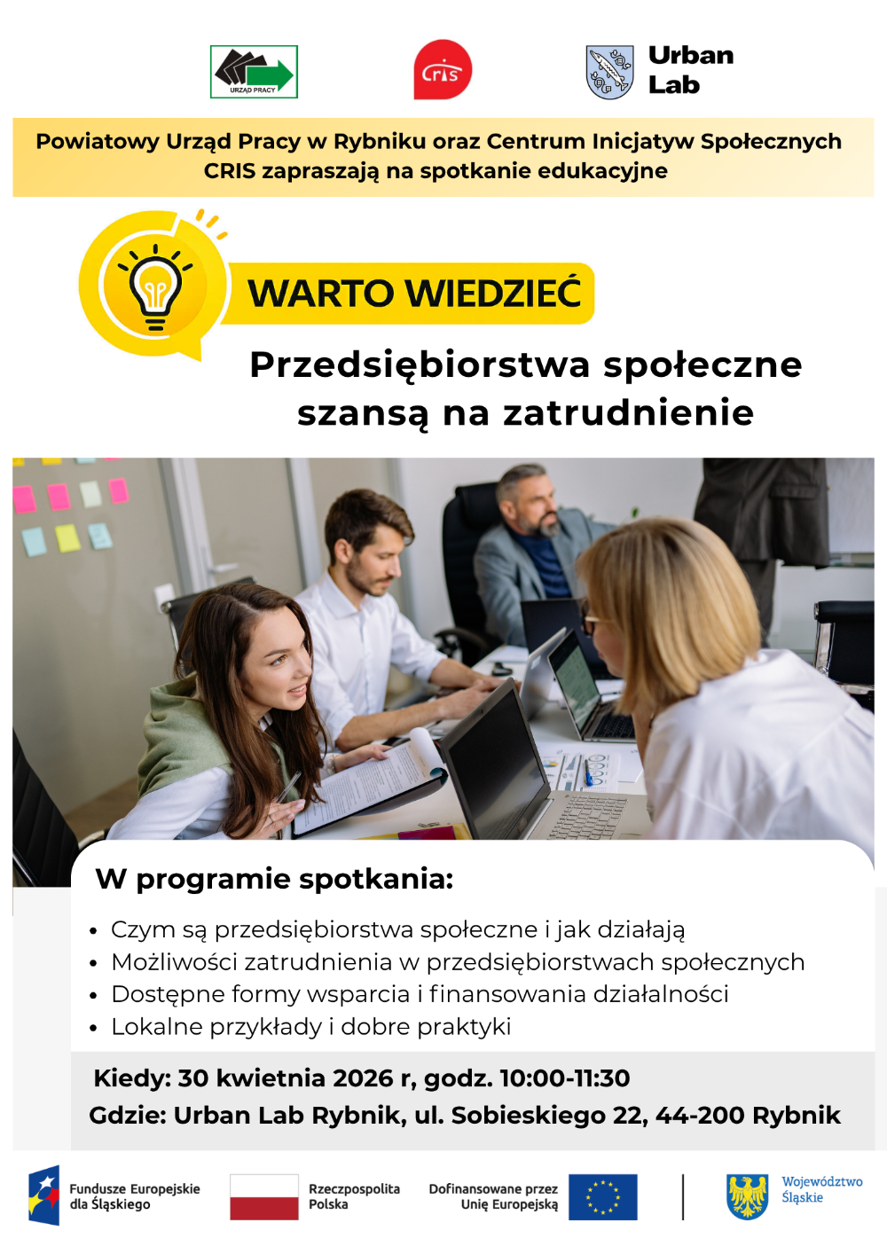 Powiatowy Urząd Pracy w Rybniku wraz z Centrum Inicjatyw Społecznych CRIS zapraszają na spotkanie z cyklu „Warto wiedzieć” pt. „Przedsiębiorstwa społeczne – szansą na zatrudnienie”.