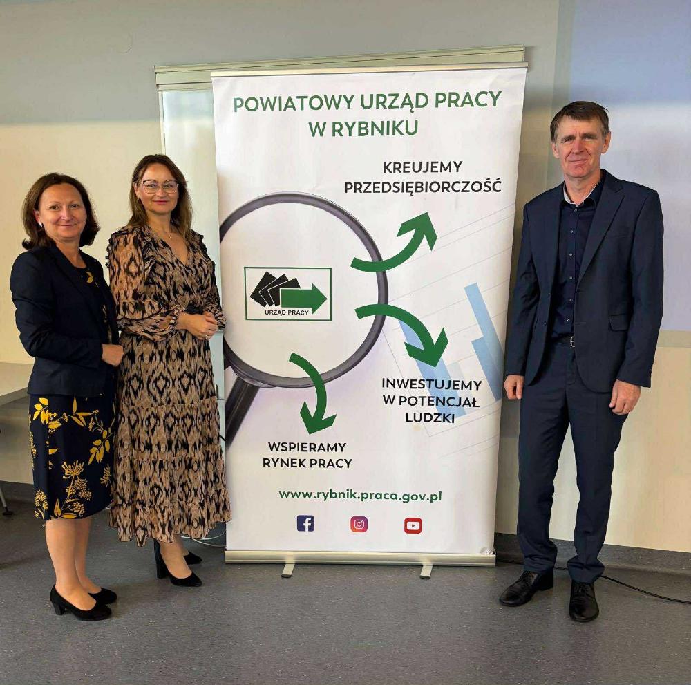 W dniu 15 października 2025 r. w Urzędzie Miasta Rybnika odbyło się spotkanie pn. „Wsparcie z Funduszy Europejskich dla przedsiębiorców”, zorganizowane przez Wojewódzki Urząd Pracy w Katowicach. W wydarzeniu uczestniczyła Dyrektor Powiatowego Urzędu Pracy w Rybniku – Dorota Małyszko wraz z Kierownikiem Działu ds. instrumentów rynku pracy – Hanną Witą oraz Kierownikiem Działu ds. szkoleń i programów – Grzegorzem Gołąbkiem.