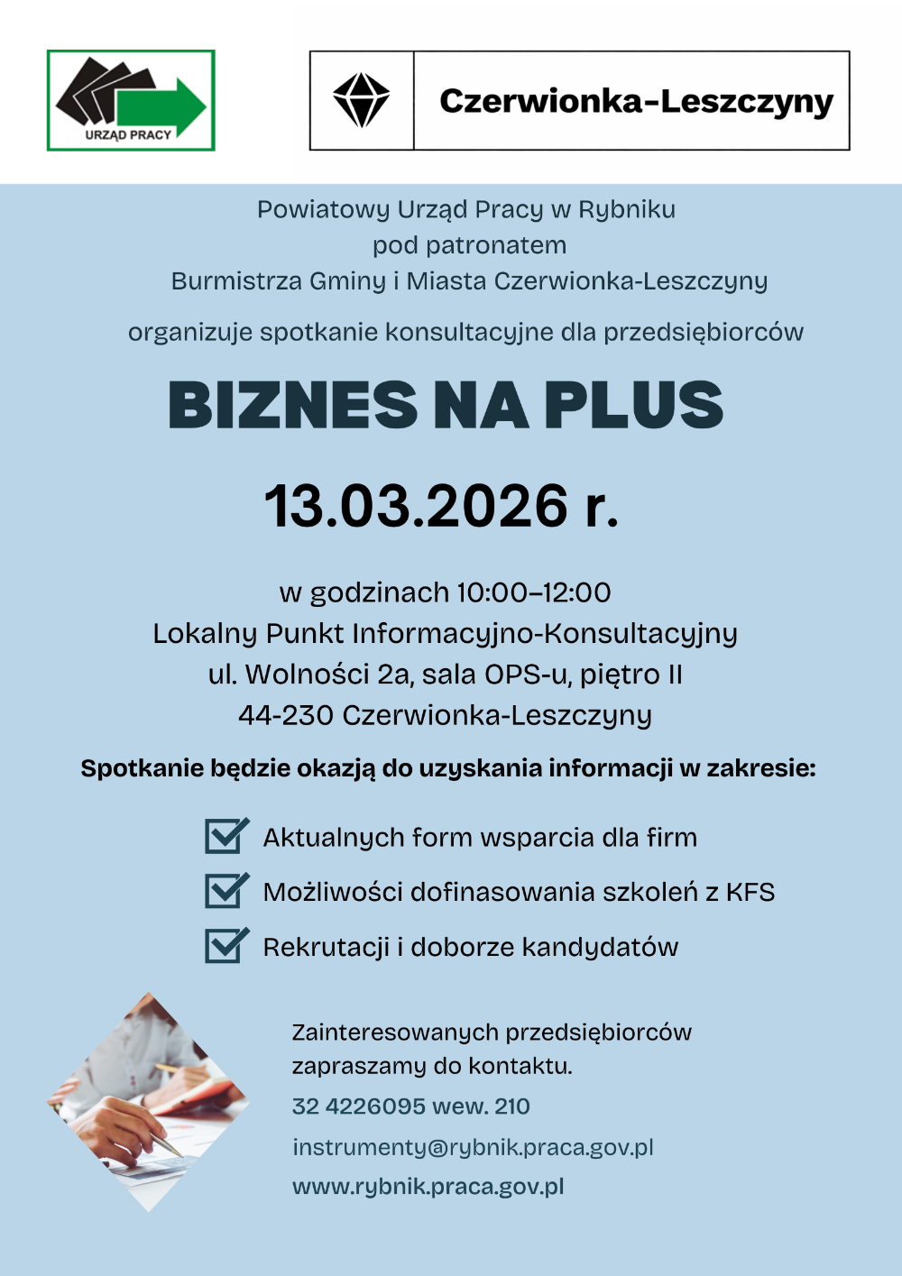 „Biznes na Plus” – zapraszamy przedsiębiorców z terenu Gminy i Miasta Czerwionka-Leszczyny na spotkanie konsultacyjne - Powiatowy Urząd Pracy w Rybniku