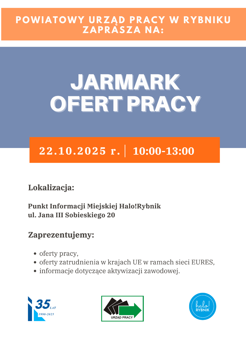 Powiatowy Urząd Pracy w Rybniku zaprasza osoby bezrobotne oraz poszukujące zatrudnienia do udziału w Jarmarku Ofert Pracy, który odbędzie się w dniu 22 października 2025 r. w godzinach od 10.00 do 13.00 w Punkcie Informacji Miejskiej Halo!Rybnik, ul. Jana III Sobieskiego 20.